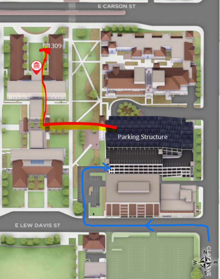 From Clarke Ave. turn West onto E. Lew Davis St., then take the first right into Lot 3, proceed thru Lot 3 and make a right into the parking structure. The meeting is on the ground floor of Building “T” in room T-1309